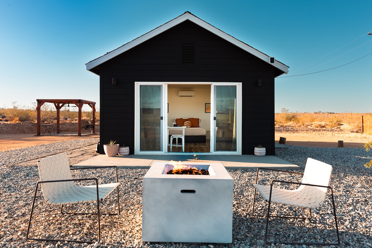 The Rum Runner. A modern take on the classic desert homesteader. Highlights include: -Hot Tub -BBQ Grill -Tesla Charger -Multiple Fire-pits -Parachute Linens -Sonos Sound System -Endless Desert Views -Multiple Cowboy Tubs -Fully Equipped Kitchen -Outdoor Stargazing Daybed -Large Shaded Patio with Outdoor Dining -Sun Room with 8x20’ Retractable Glass Wall -Indoor Mural designed by local artist Ana Digiallonardo