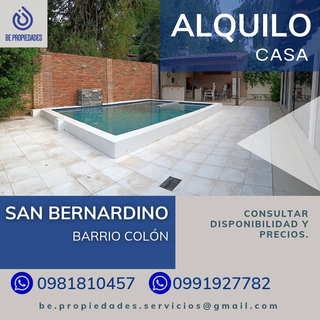 Hermosa casa en la ciudad de San Bernardino, Paraguay, a 2 cuadras del Lago. Construcción nueva, concluida en 2019. La misma cuenta con 3 habitaciones, una de ellas en suite con 1 cama King y las otras 2 con 6 camas individuales con baño compartido. Cuenta con una sala comedor de 55 m2, con parrilla incorporada. 1 Baño social. Piscina de 6 x 3 m. Cuenta con un Generador de 10 kVA, con tablero de transferencia. Un increíble espacio para poder compartir el tiempo con la familia y los amigos.