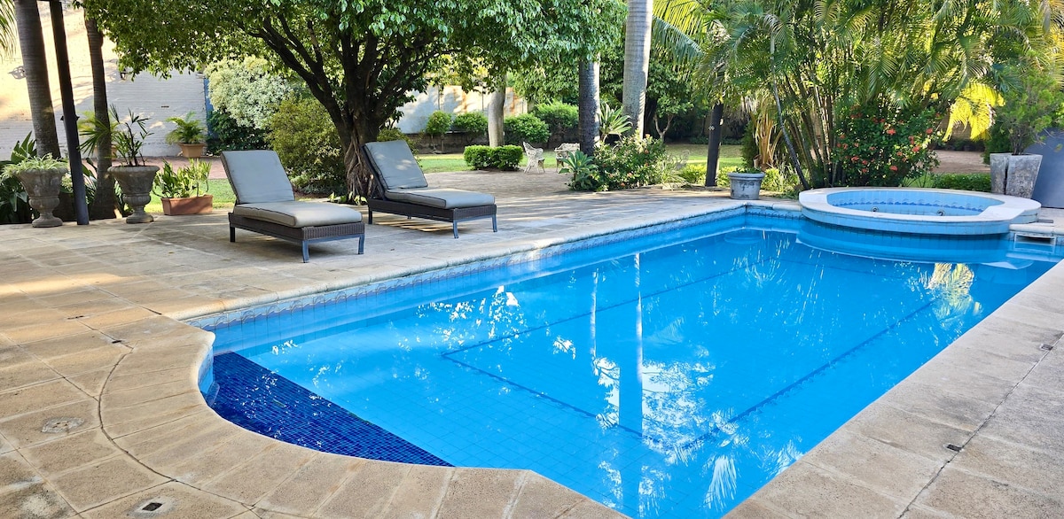 Here you can relax in peace or have a lavish party, just as you like! With every comfort, in the middle of nature and yet close to San Bernardino and just a stone's throw from Caacupé with its basilica. Enjoy the unobstructed view of the valley of Ypacaraí up to the skyline of the capital Asunción. In the pool or on the terrace you can enjoy the day and then the romantic sunset. Or would you rather have a glass of champagne in the indoor whirlpool?