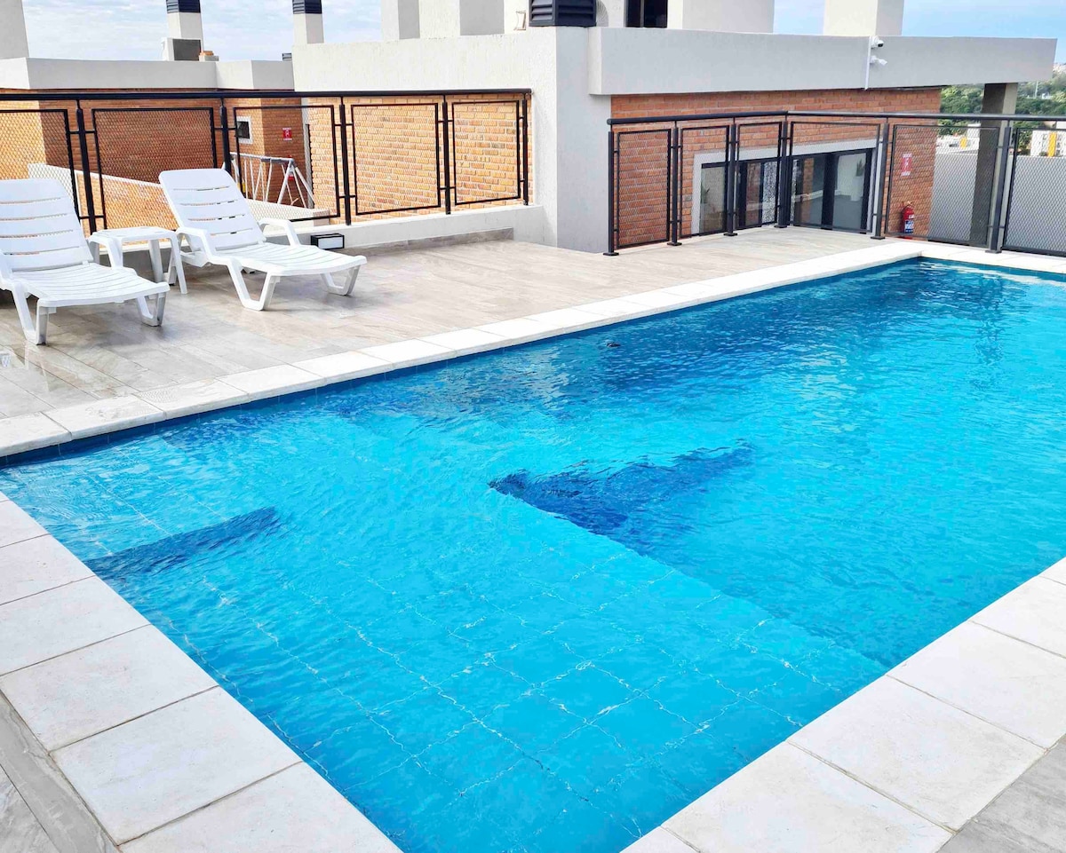 Moderno departamento totalmente amoblado a estrenar, a minutos del aeropuerto Silvio Pettirossi y eje corporativo de Asunción, ideal para viajeros de negocios, escalas o estadias comodas. Check-in 24hs. Con muebles nuevos, Smart TV, WiFi y un cómodo sofá cama (¡y más!). Relájate en la gran piscina o disfruta de las parrillas, la cancha de pádel y cancha multiuso para fútbol y vóley. Ideal para una estadía perfecta. ¡Reserva ahora!