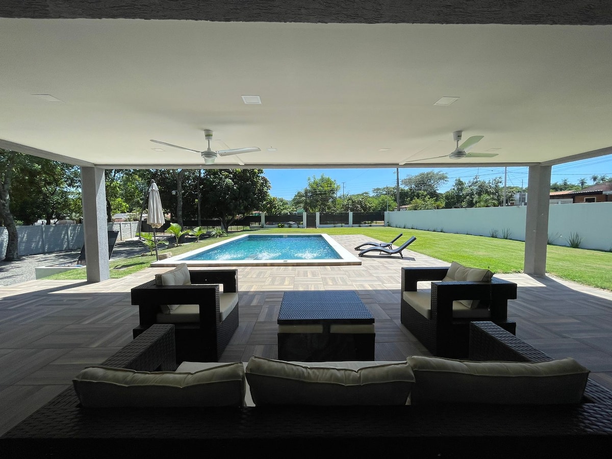 Discover Villa Helena in San Bernardino! Our 2-bed, 3-bath haven features a big yard, Big pool, Wi-Fi, cable/Smart TV, AC in all rooms & ample parking. A fully-equipped kitchen and washing machine. Walk to a main road and a 24-hour convenience store. Accommodating 8 guests, the master bedroom and a room with 2 bunk beds and 1 double bed, plus a sofa bed in the living room,. The Quincho BBQ area with blindex/AC, grill, tatacua (pizza oven), bar, and bathroom promises delightful gatherings.