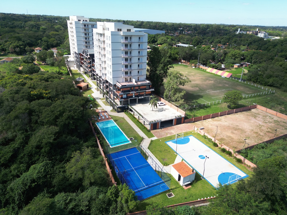 Moderno departamento totalmente amoblado a estrenar, a minutos del aeropuerto Silvio Pettirossi y eje corporativo de Asunción, ideal para viajeros de negocios, escalas o estadias comodas. Check-in 24hs. Con muebles nuevos, Smart TV, WiFi y un cómodo sofá cama (¡y más!). Relájate en la gran piscina o disfruta de las parrillas, la cancha de pádel y cancha multiuso para fútbol y vóley. Ideal para una estadía perfecta. ¡Reserva ahora!