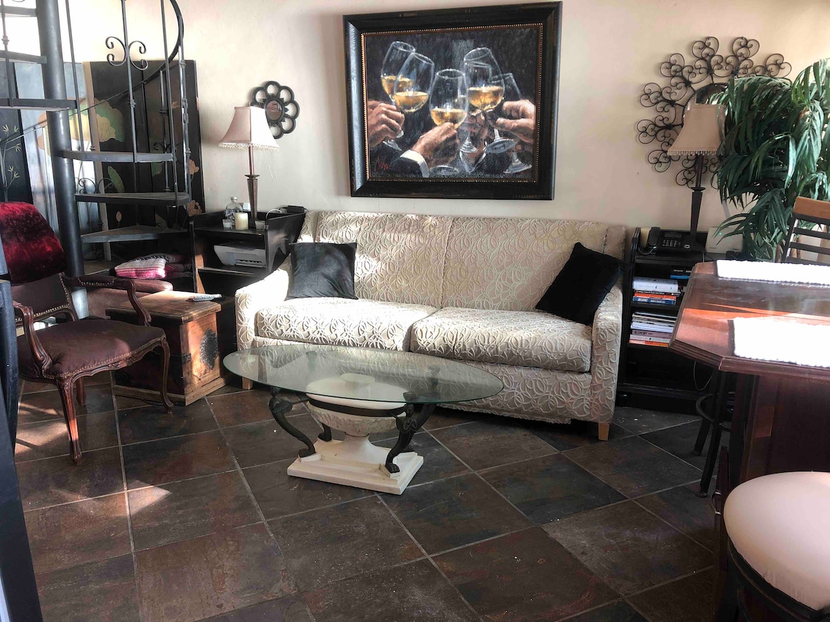 Hotel Casa Pachamama, habitación SOL, te brinda la calidez y el espacio que tu familia necesita para vivir una estancia inolvidable. Ideal para familias pequeñas. Cuenta con: •Una habitación privada, con cama matrimonial •Sala con sofá cama (2 camas individuales) •Un baño completo •Cocineta completamente equipada y comedor pequeño. Todas las comodidades (aire acondicionado, ventiladores de techo, wifi, TV, agua caliente. *El área de alberca y jardín son compartidas con otros huéspedes.