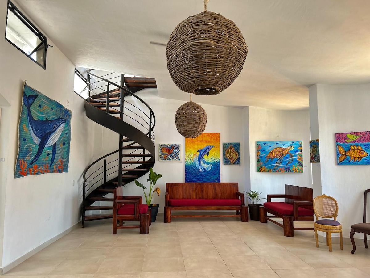 Enjoy our comfy beach house with 360 views. Each room comes with private bathroom and private large balcony where you can see the beautiful sunrise and sunset. Mini fridge and hot/cold water included. Common areas include rooftop terrace and pool with lounge space. We are only a few steps from playa hermosa a virgin beach. Great beach for surfing and swimming. Close to playa borrego with great ramadas close by to grab a delicious meal or a fresh coconut. Adults only and 420 friendly.