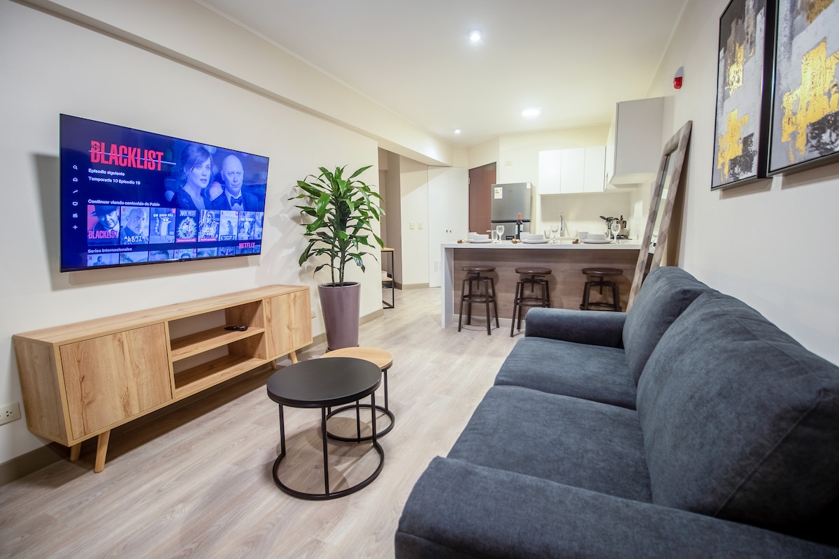 Wake up to open skyline views just half a block from Kennedy Park, in the heart of Miraflores. This luminous boutique loft is ideal for longer stays and remote work. Floor-to-ceiling windows throughout the apartment offer views over Av. Diagonal, the building’s garden courtyard, and the Miraflores skyline. Enjoy rooftop pool, gym, coworking, private parking, ultra-fast Wi-Fi, self check-in, and 24/7 reception—steps from cafés and Lima’s best dining.
