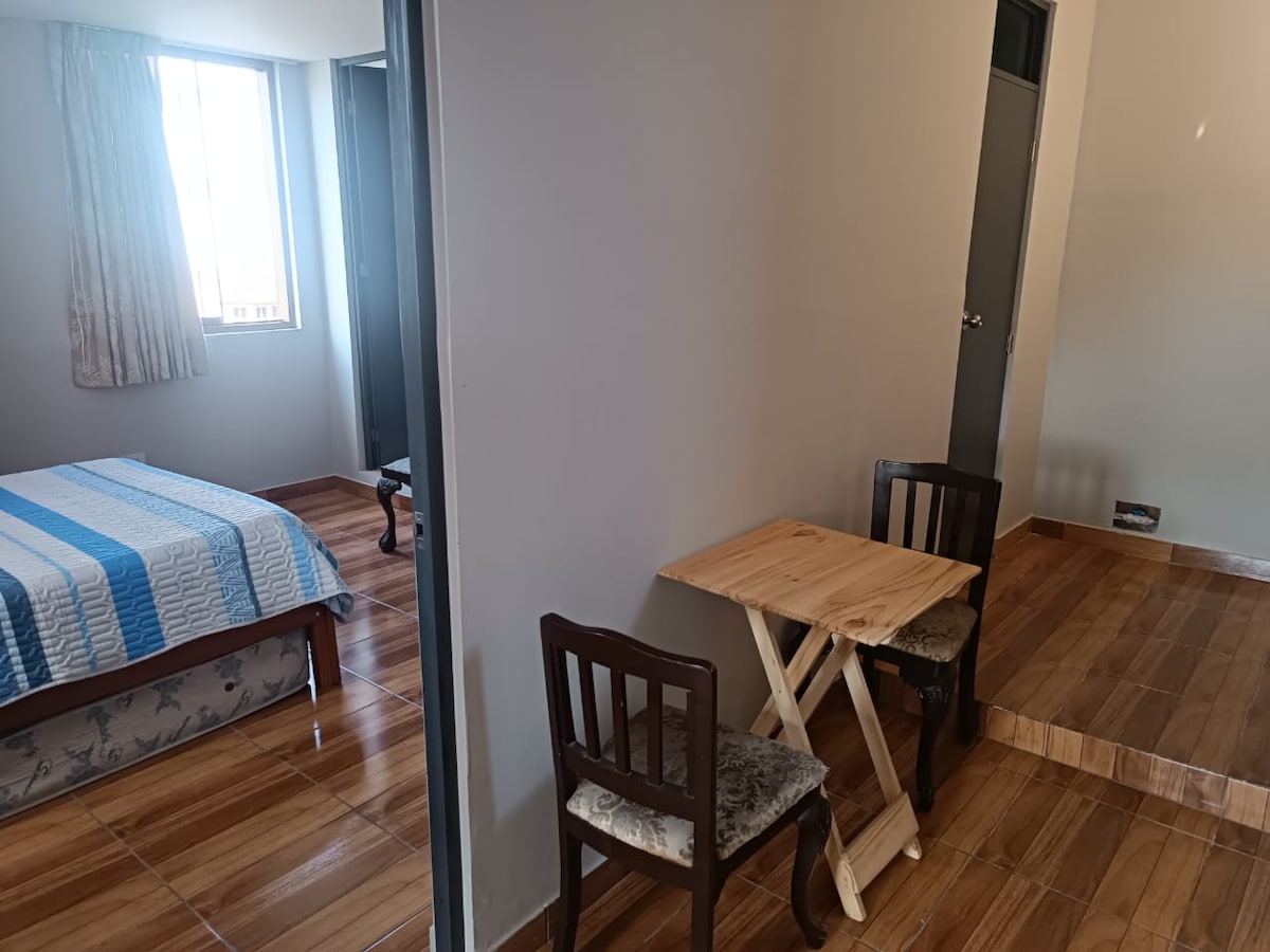 Habitación de 35mts2 con kitchen tipo americana en 4to piso con entrada independiente, amoblado (cama de 2 plazas, mueble modular doble, cómodas y closet) cuenta con tv Smart de 42" con NETFLIX y cable, un refrigerador, cocina, hervidor de agua, licuadora, tostadora, arrocera, ducha con terma, wifi, menaje en la cocina (vasos, tazas, platos, cubiertos), también proporcionamos toallas de manos y de baño.