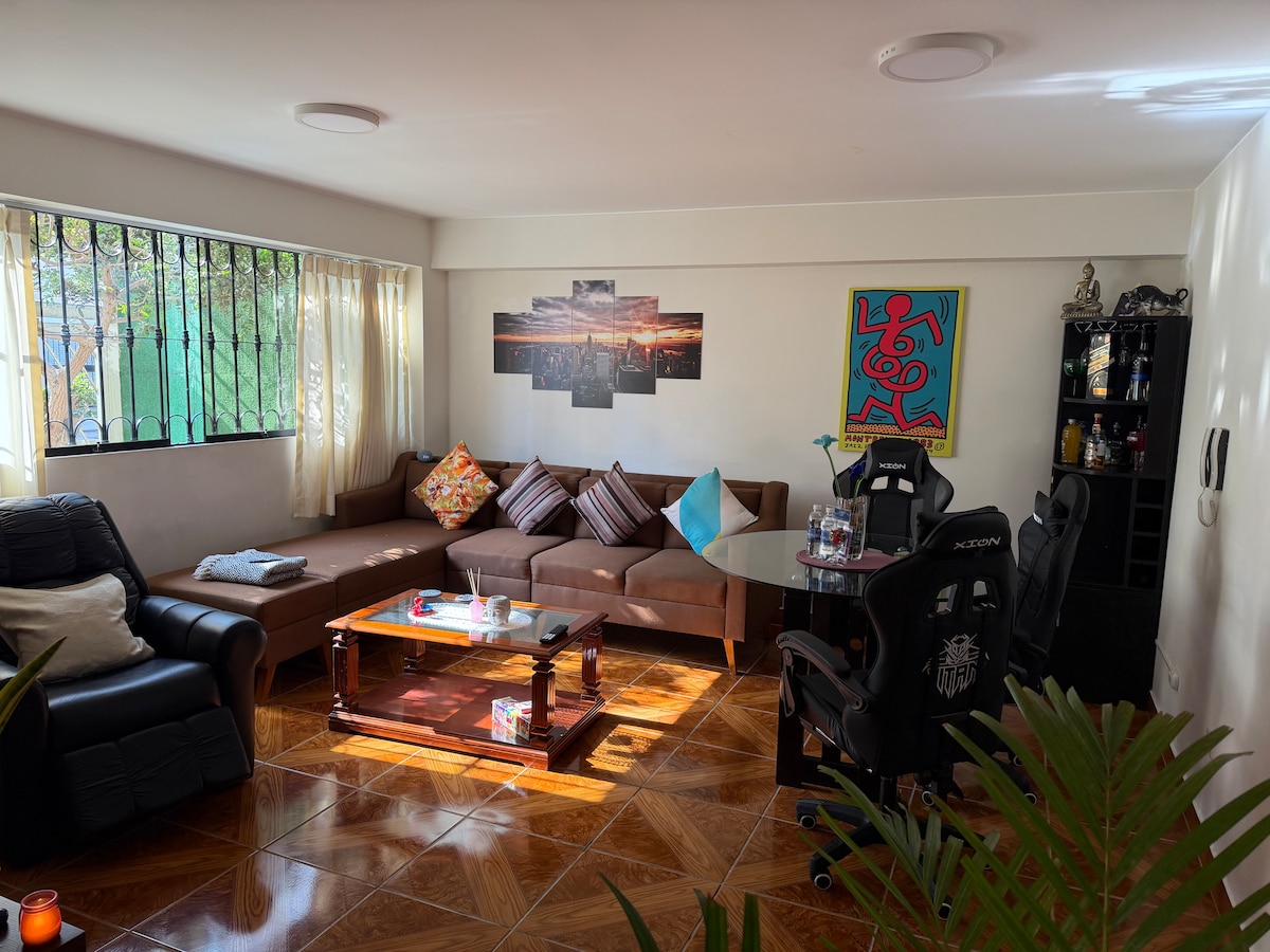 Disfruta de un apartamento cómodo y elegante, solo para ti, en la mejor zona de Lima!! En nuestro espacio encontrarás todo lo que necesitas para relajarte, para un viaje romántico, para una estadía en familia o para seguir trabajando. A solo unos minutos de "Lima Histórica" y del hermoso malecón de Miraflores. Puedes movilizarte en auto propio, en taxi o en transporte público! Muy cerca de áreas verdes, ciclovías, playas y de los mejores restaurantes de la ciudad!! Te esperamos!! :)
