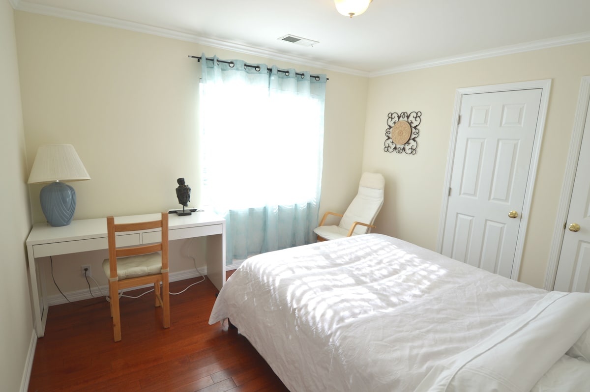Well lit guest bedroom with private bathroom attached. A hot water kettle in the room for making tea and a coffee maker and french press, a microwave and mini-fridge. Coffee and homemade muffins or bread along with fruit will be provided in the mornings. We have 2 dogs. Our Irish Setter Molly is 10 years old and Lily, who is a mixed terrier is now 3 years old. They are both friendly and love to meet our guests, when and if you would like to meet them as well.