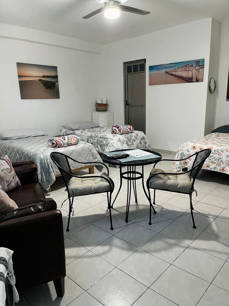 departamento con cocineta completa, equipada con electrodomésticos, trastes de cocina, estufa con horno, refrigerador et. cuenta con comedor de 4 sillas y barra con bancos para su mejor comodidad. en el departamento encontrara amenidades y todo lo necesario para su estancia placentera, en familia o de trabajo. también tiene wifi y estacionamiento privado. nos encontramos en la avenida principal del puerto , a tan solo 3 cuadras de la playa.
