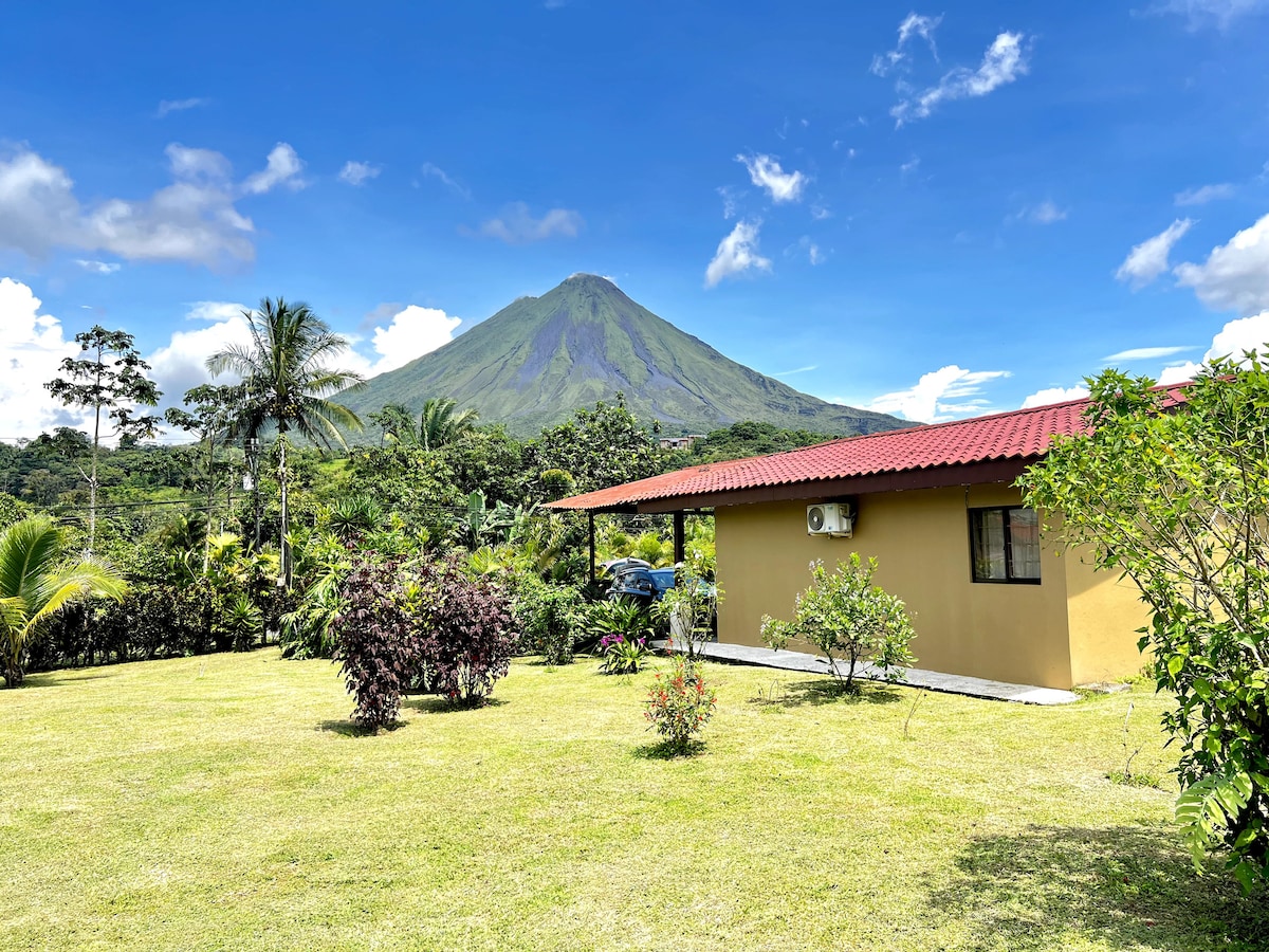 Comfortable cabin with direct view to Arenal Volcano just 2 miles away from downtown La Fortuna just a bit away from the busy town but far enough to rest and enjoy the countryside close to town. Safe parking in an gated property, king size bed, fully equipped kitchen, private bathroom with hot water, A/C unit, WIFI (10/10 megabytes), Cable TV, safety deposit box and a great balcony with volcano view. The property is close to all main attractions in the area, just 10 to 35 minutes drive ratio.