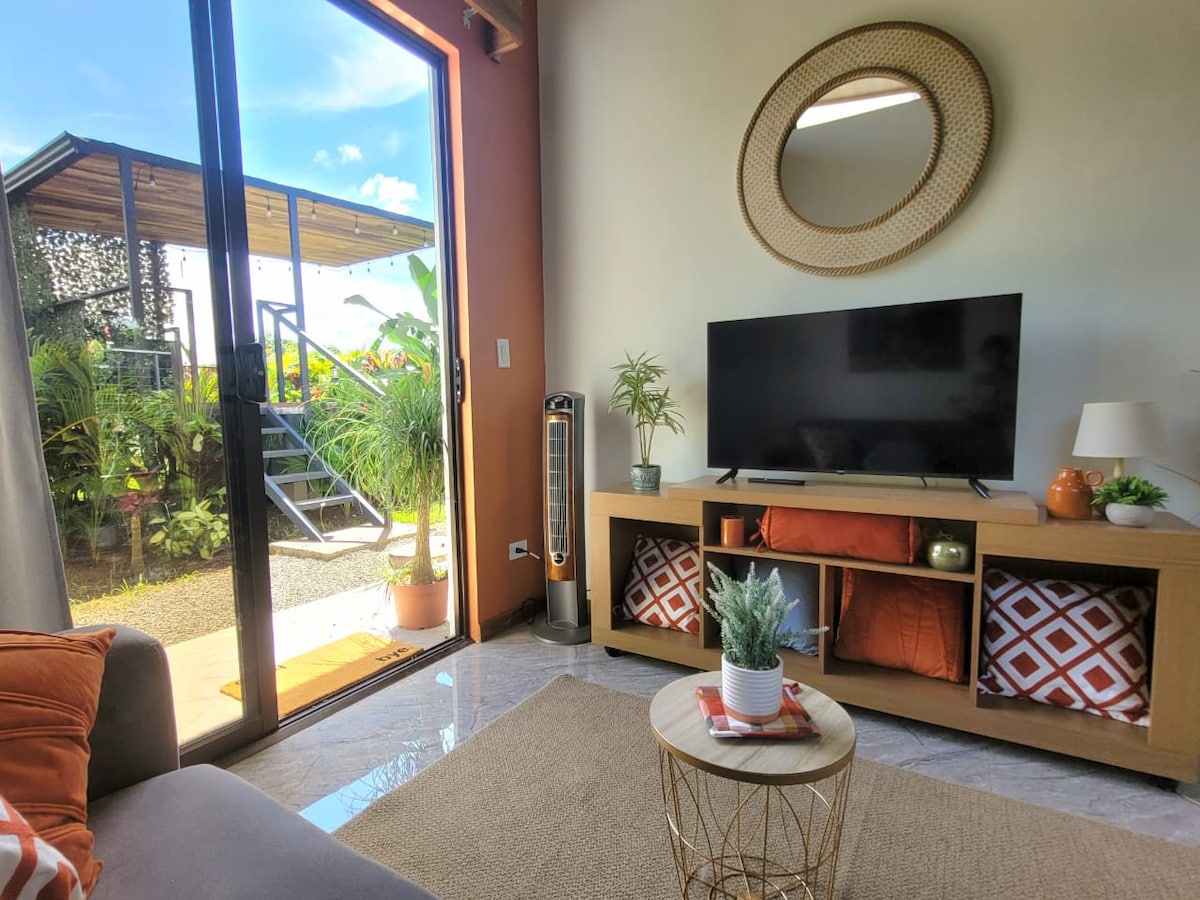 This beautiful studio is located just couple blocks away from La Fortuna downtown, which offers the versatility to explore the town and the touristic area without renting a car or parking and walking around This place is fully equipped, from fast wifi (+200mbps), comfortable King size bed, A/C, Smart TV, kitchenette, dehumidifier. A private front porch with table, chairs & JACUZZI, full private bathroom with hot water and hair dryer, safety box large enough for computer, closet and parking spot