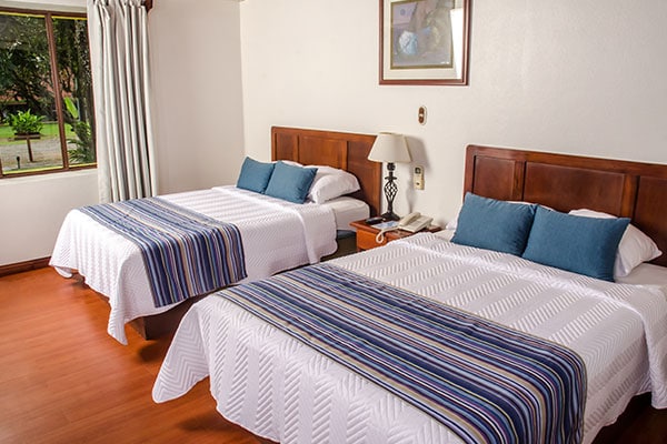 Habitación Olimpo: Amplia habitación con capacidad para 5/6 personas, acondicionada con una cama matrimonial, tres individuales y un sofá cama, mesas de noche y lámparas. Decorada con pinturas de tela óleo con temas locales de artistas costarricenses, TV de pantalla plana de 43’’ aire acondicionado y ventilador de techo un armario de madera, amplio clóset donde se encuentra una refrigeradora y la caja fuerte. Baño privado con ducha de agua caliente. Ubicados a 2,5km del centro de La Fortuna, Z13