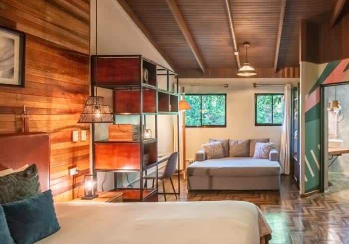 Hotel Boutique Casa del Río Spacious room with a King bed, twin bed, and a kitchenette, perfect for couples or small families. Features a private balcony with rainforest views, air conditioning, Wi-Fi, smart TV, and a bathroom with hot water. Guests have access to all hotel amenities: restaurant, pools, Jacuzzis, gym, basketball court, three padel courts, and a semi-Olympic pool. Breakfast included at our restaurant with views of the Arenal Volcano.