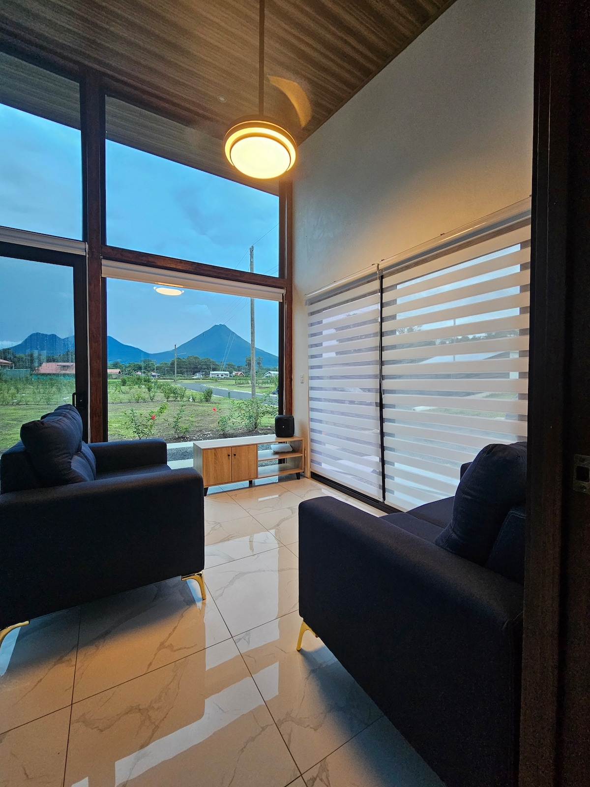 This beautiful, cozy Villa with an amazing arenal volcano view is located just outside of La Fortuna, a couple blocks away from downtown. For your comfort the house features: fully equipped kitchen & living room, couch, high speed Wi-Fi, 2 bedroom with a king size bed, A/C, one T.V at the living room area & cable and Bluetooth speakers, as well as washer and dryer. Full bathroom with toiletries. The back yard features a stone hot tub, infinity pool, swim up bar, sun deck and outdoor showers.