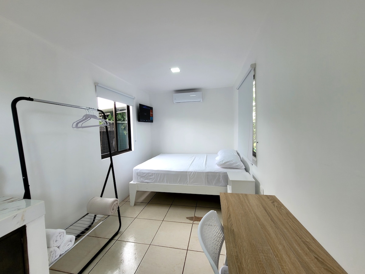 Esta habitación está fabricada con amor , baño cocina y cuarto principal con vista a la naturaleza, los acabados son de madera de teca exclusiva y los muebles de la cocina con madera de cedro , amplios armarios / escuchas el río que pasa al lado , te conectas con el entorno / luces cálidas / tv retráctil/ cocina de gas / refrigerado grande / cama king / tenemos un sendero privado para caminar y un puente de hamaca para ustedes disfruten , 5 minutos del centro de la ciudad ….