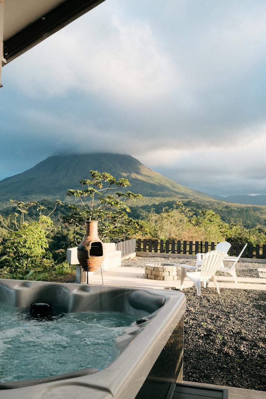 This new romantic, luxurious and wellness villa offer you the best sensorial experience. With an amazing jacuzzi immersed in a tropical garden. This Villa is located just 3 blocks from the center of Fortuna and at the same time, away from the noisy streets. 100% equipped with: cooking area, 300Mbps fiber internet, big king bed, air conditioning, 55'' smart tv, unique bathroom surrounded by exuberant nature. A lower terrace and an upper terrace with the best panoramic view of the arenal volcano.