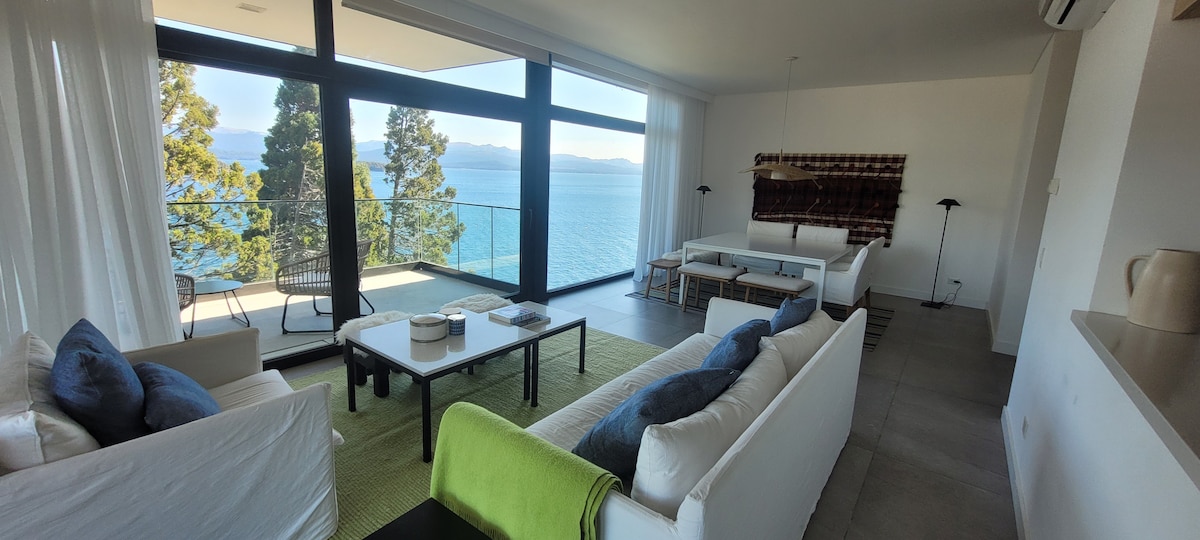 Espectacular departamento a estrenar frente al lago Nahuel Huapi. Excelente ubicación, sobre una de las avenidas principales de la ciudad, a siete kilómetros del centro y del Cerro Catedral. En un entorno único y con una vista inigualable del lago y sus islas. Departamento totalmente equipado para seis personas. Tres dormitorios, dos baños completos, dos toilettes, cocina, living-comedor y amplio balcón. Terraza con parrilla e hidromasaje para cuatro personas. Piscina climatizada en verano.