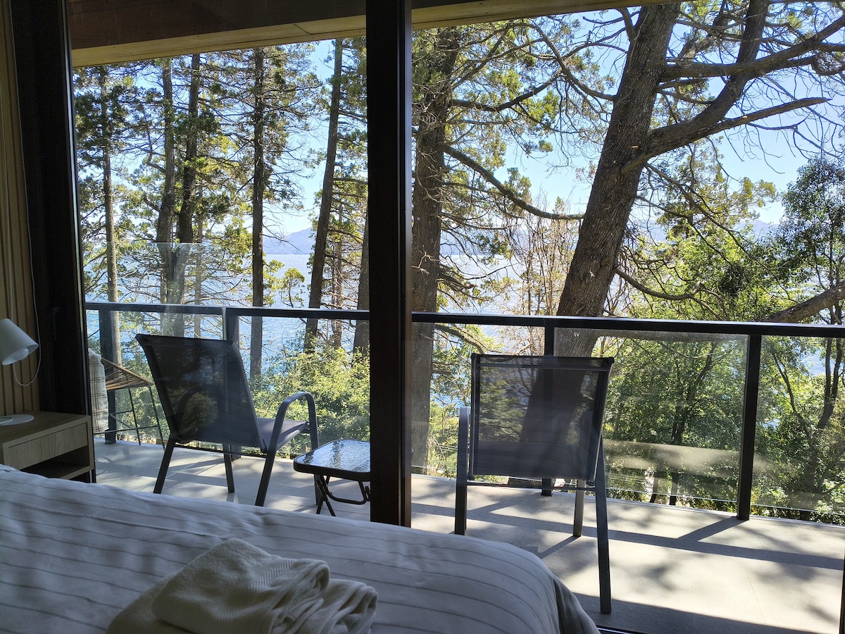 Departamento moniambiente de 50 mts2 con imponente vista sobre el lago y a la Isla Victoria en la zona de Llao Llao. Tiene un pequeño living, cocina completa con horno y microondas, cama king size que dan a un balcón terraza. Baño completo con bañadera Bajada propia a la costa de lago Servicios Wifi Balcón terraza con reposeras Ropa de cama y toallas se cambian c/ 5 días Secador de pelo Estacionamiento privado Exclusivo para parejas No hay desayuno No hay Tv Se cobra limpieza final usd20