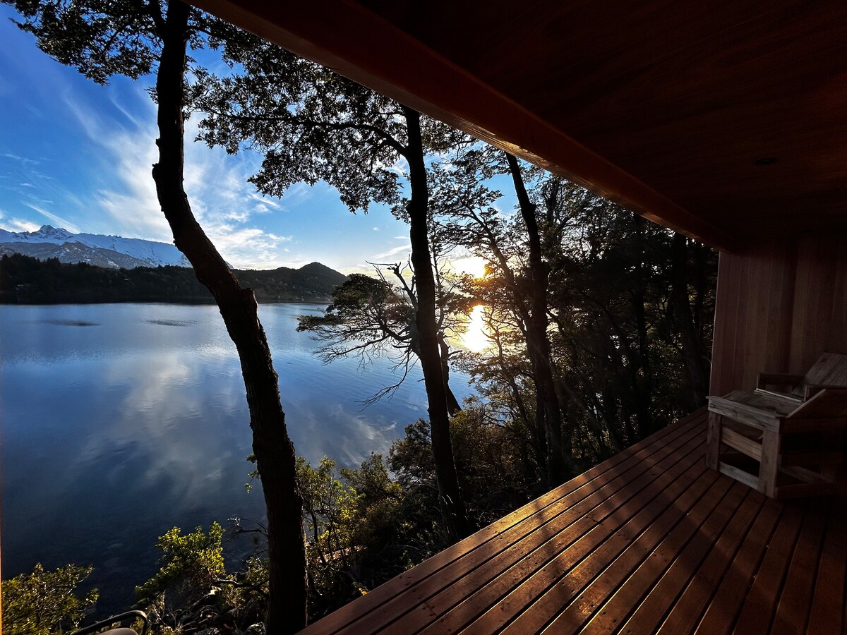 Cálida cabaña de estilo rústico a orillas del lago Nahuel Huapi con hidromasaje, hogar a leña, y deck. Monoambiente creado para el relax y el romanticismo con vista al amanecer y salida de la luna sobre el lago. Smart TV e internet por FIBRA OPTICA con wifi para trabajar. Una kitchinette con todo lo necesario, incluyendo cafetera dolce gusto. Caja de seguridad para resguardar tus notebooks al ir de paseo. Baño completo. Pool, ping-pong. Playa: Kayak y standup paddle. Desayuno continental.