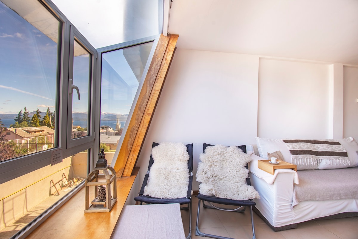 Este departamento, moderno, elegante y con gran espacio, es ideal para que tu viaje de a dos sea inolvidable! Podrás disfrutar de una amplia vista panorámica hacia el lago Nahuel Huapi y las montañas de fondo, con el cielo en todo su esplendor! Su estratégica ubicación, hace que estés a menos de 20 minutos del Aeropuerto, a poco más de 1 km de la Terminal de buses y del Centro, y a 200 metros del camino de la Costanera, desde donde apreciarás el imponente lago y las montañas. Te esperamos!!!