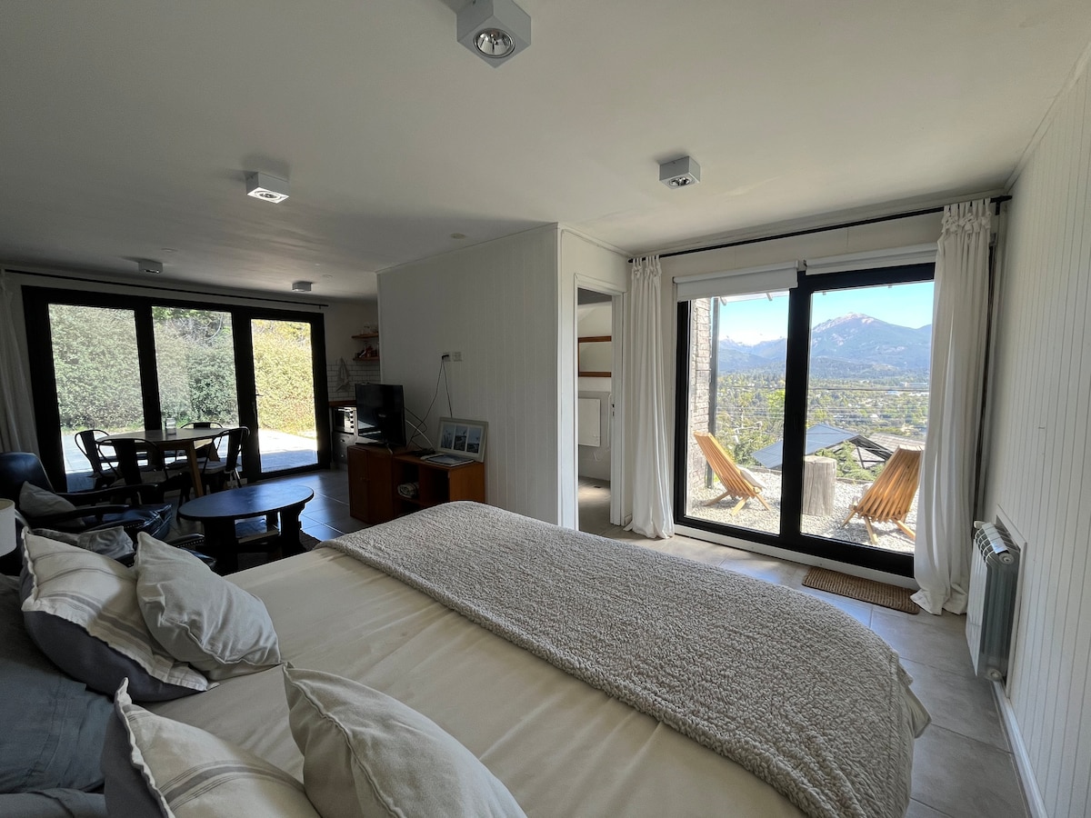 Relájate en este alojamiento bonito, acogedor y tranquilo. Monoambiente nuevo 32 m2, equipado para 2 adultos. Decoración estilo vintage-nórdica. Cochera propia al aire libre dentro del predio cerrado incluida en la estadía. Baño con bañadera con ducha, bidet, inodoro, vanitory. Dormitorio con somier de 2 plazas. Cocina comedor completamente equipada. Mesa, sillas y futón de madera. Textiles Televisor 24" Chromecast. Internet. Frente vidriado con 1 puerta y 1 ventana. Vista al lago y montañas