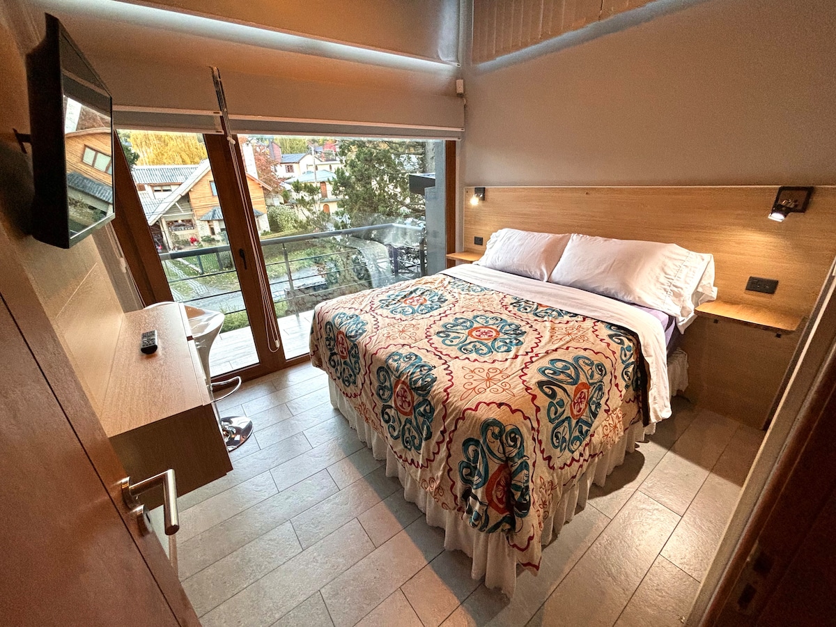 Casa Huenu is perched high overlooking Nahuel Huapi lake and the surrounding mountains. Sit back and enjoy the homey escape with all the modern cons. This ground-floor 1 bedroom apartment, suitable for 2 - 3 people but with beds for 4, is located in the residential neighborhood, Belgrano with the town easily reachable on foot. It has a high speed wifi and a table with a view that can be used as a workstation.