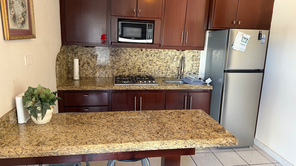Condominio tipo Suit , equipado con: Dos camas Queen, sofa cama matrimonial, cocineta con micro ondas, estufa y frigo bar; lavadora y secadora; terraza con vista ala playa. Tienes acceso directo a la Playa, una piscina remodelada con vista al mar y un comodo jacuzzi en el area comunitaria Tu familia estará cerca de todo si te hospedas en este alojamiento céntrico.