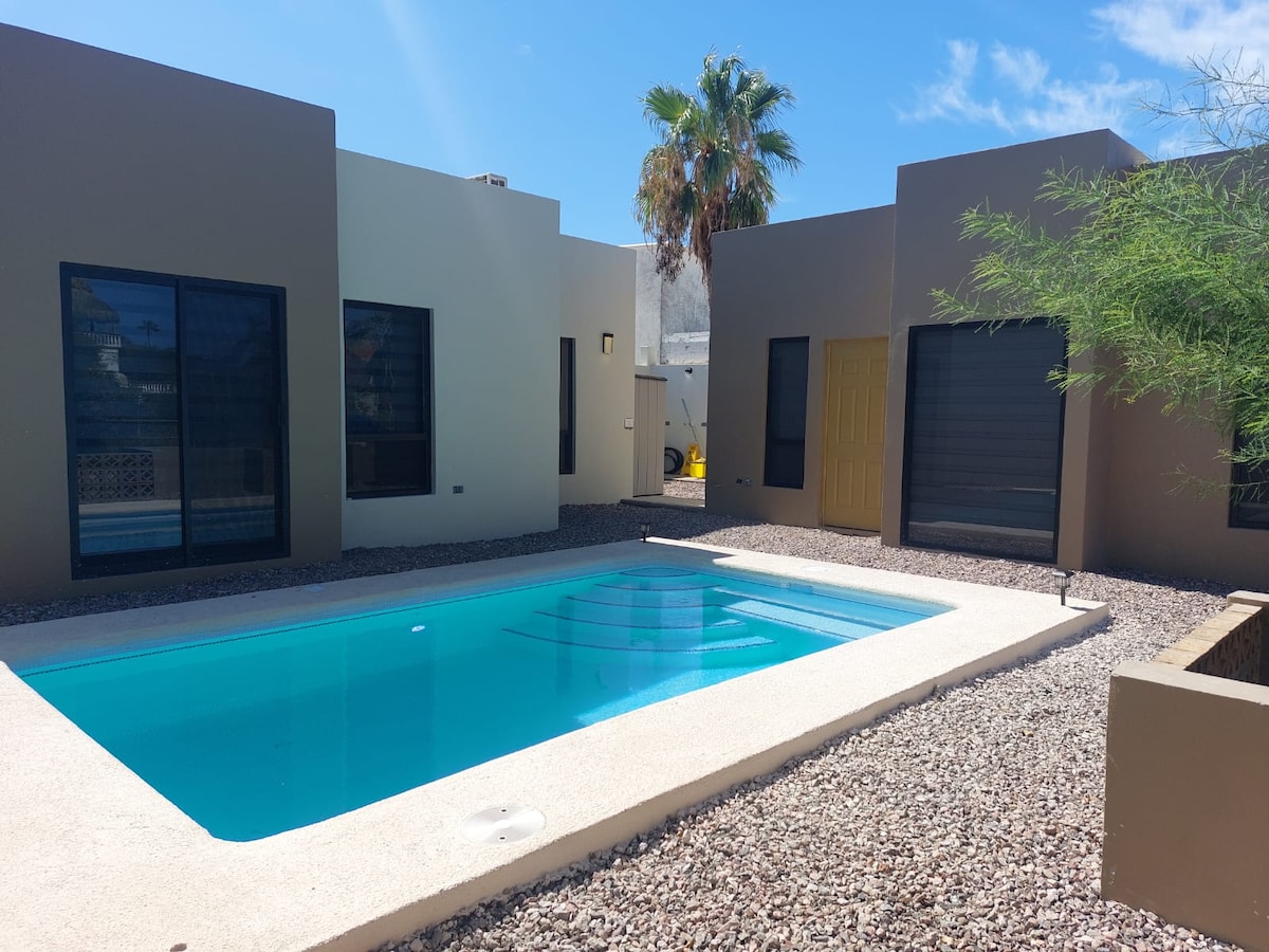 This airy, modern and inspiring home sits in front of the golf course. Nothing fancy so you can focus on what truly matters: indulging yourself with incredible mountain views while relaxing in our private pool. Located in the heart of San Carlos within a quiet gated community -where visitors are asked to respect the serenity and peace of their neighbors-, this is the place where you will truly enjoy every moment of the day. Enjoy exotic desert-beach views. Looking forward to hosting you!