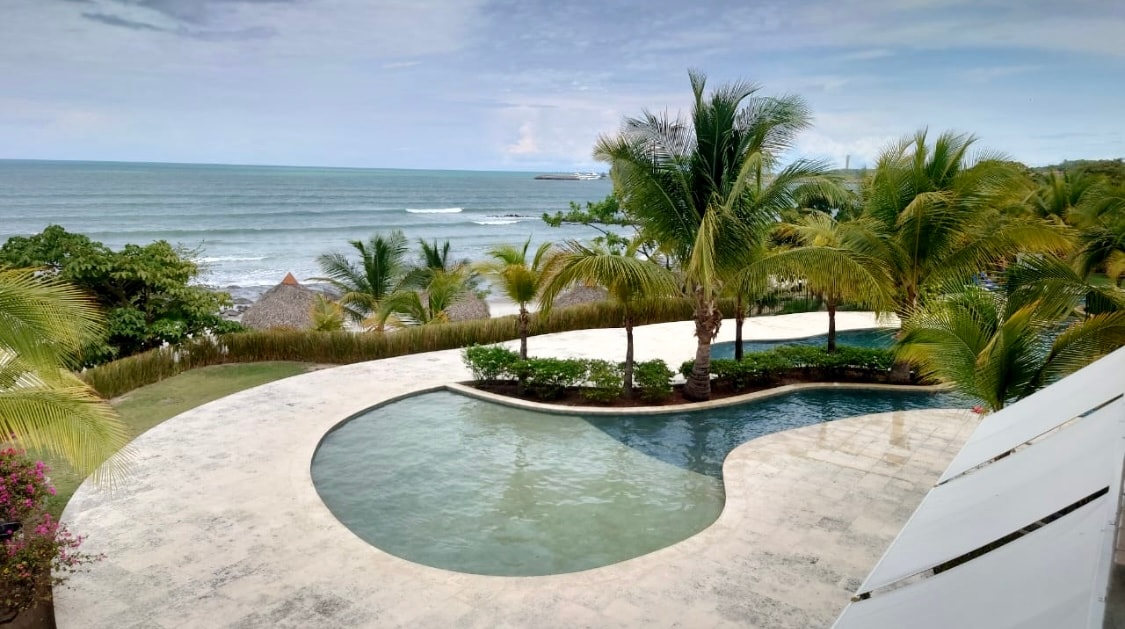 Lindo apartamento frente al mar , con todas comodidades, espacios elegantes y confortables. Contenido: dos recamaras totalmente independientes dos baños con duchas Cocina completamente equipada centro de lavado gratis Aires acondicionados en todas las habitaciones dos salas, una en el balcón con vista panorámica y otra sala con TV Amplio, acogedor balcón privado con tumbona frente al mar wifi Área de BB y piscinas Muy cerca de la escuela de Surf y restaurantes locales e internacionales.
