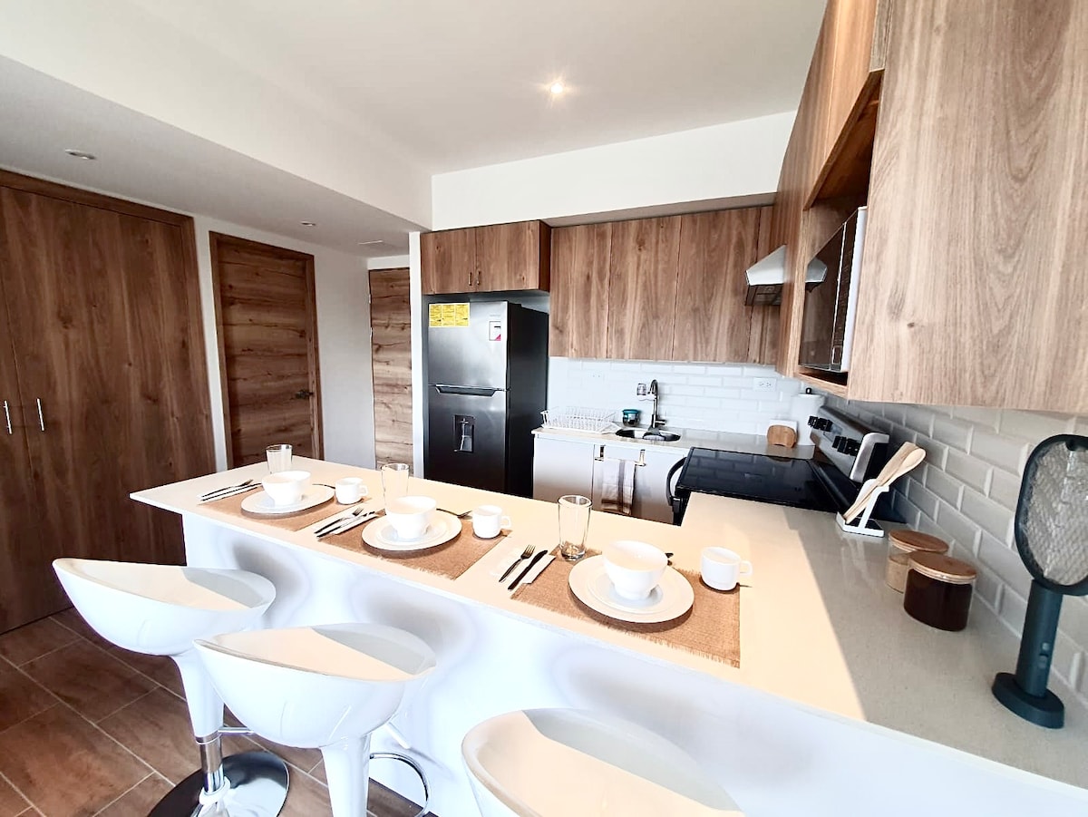 Vive la experiencia de lujo en las alturas de la ciudad. Este elegante apartamento con vistas panorámicas inigualables hacia los volcanes. Disfruta de una aventura exclusiva con una piscina climatizada y un ambiente cálido y acogedor. Ubicado estratégicamente cerca del aeropuerto y de las principales zonas turísticas de la Ciudad, es la opción ideal para quienes buscan comodidad, privacidad y una estancia inolvidable.