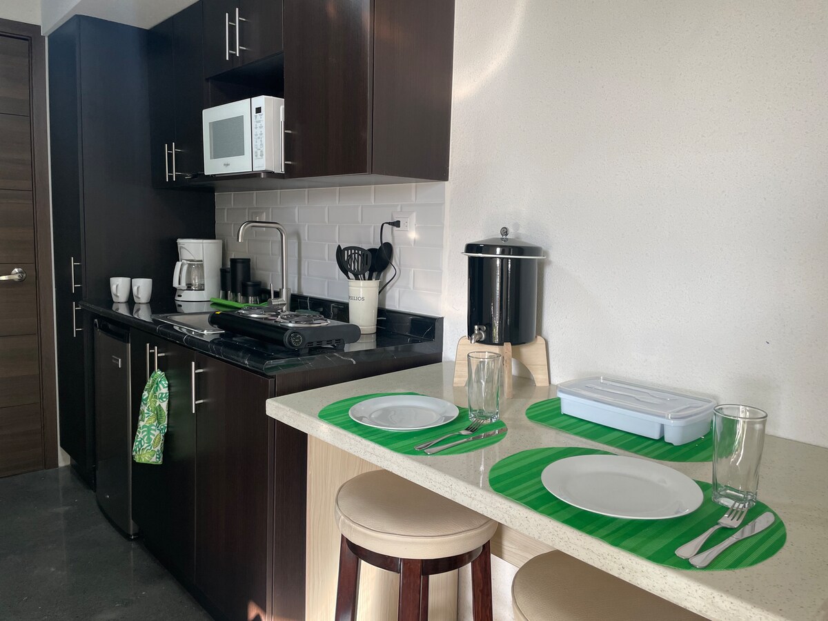 Enjoy a spectacular view of the volcanoes from your private balcony in this cozy, modern studio. It’s fully equipped with high-quality amenities, from a comfy queen-size bed to a handy sofa bed for extra guests. With a fully equipped kitchen, and black out curtains, you’ll have everything you need for a relaxed and fun stay. It includes one parking space, on-site gym and access to the building’s convenience store. Just 8 minutes from the airport is the perfect place for you and your beloved