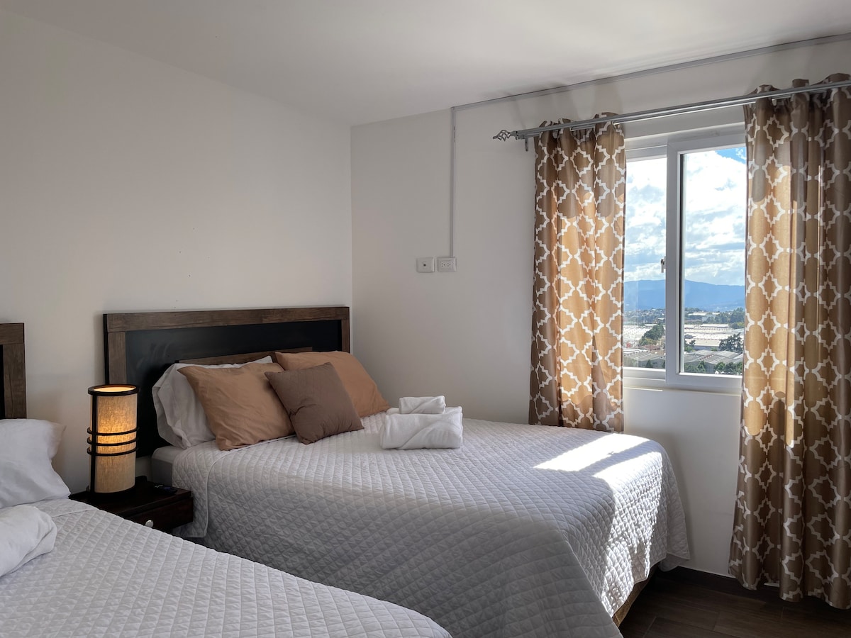 Apartamento comodo en un noveno piso, zona céntrica con desplazamientos rápidos hacia calzadas principales, restaurantes cercanos, de los pocos apartamentos en la capital con aire acondicionado en las habitaciones (2), estamos a 5 min del IRTRA Petapa, a 15 min del aeropuerto y del zoológico La Aurora, a 3 min del centro comercial Pradera Vistares. Tenemos 94 mts2 de área para que te sientas cómodo versus 74 mts2 de otros apartamentos de la zona. Vista a los volcanes 🌋 impresionante.