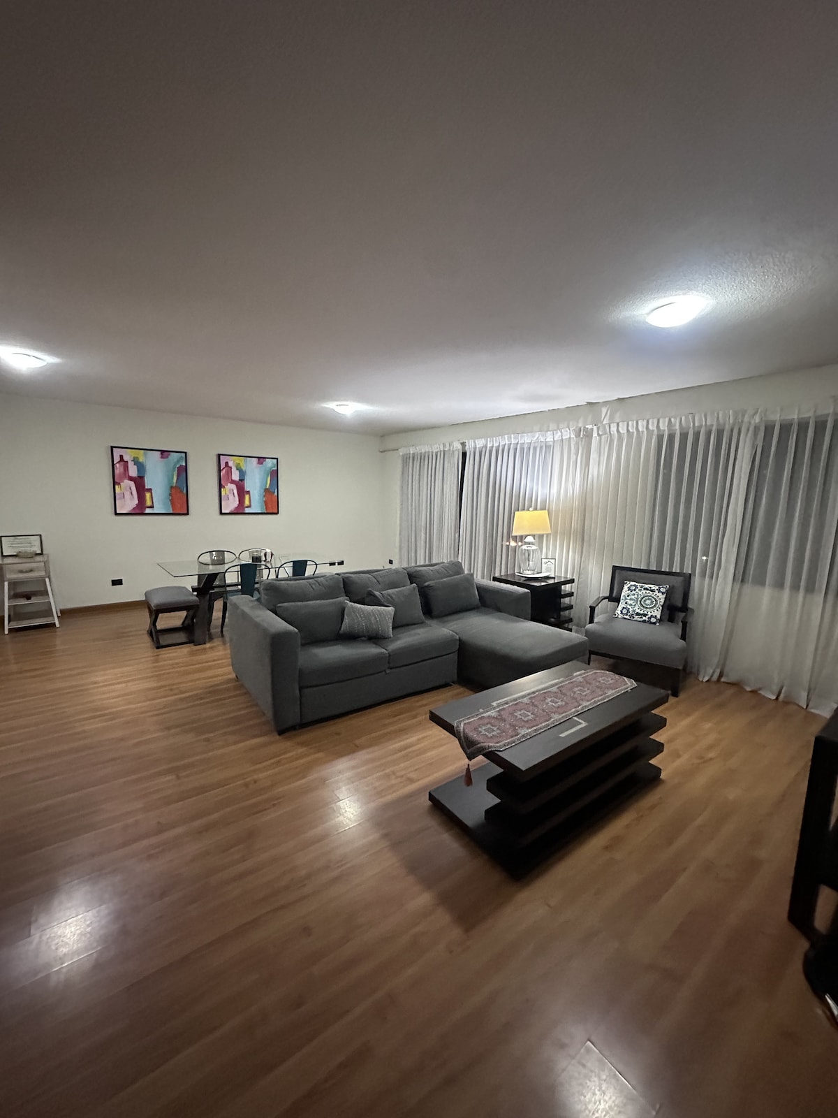 Spacious 2-bedroom apartment, located in a convenient, safe, up and coming neighborhood 15 min aways from the airport. Amenities include pool, gym, playground studio, social area, meeting room, game room, private parking, 24/7 security cameras and rooftop with electric heaters and a wonderful view of Guatemala city.