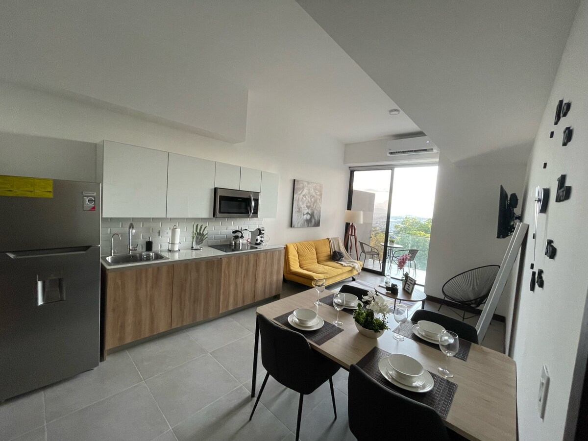 Enjoy a spectacular view of the volcanoes from your private balcony in this cozy, modern studio. It’s fully equipped with high-quality amenities, from a comfy queen-size bed to a handy sofa bed for extra guests. With a fully equipped kitchen, and black out curtains, you’ll have everything you need for a relaxed and fun stay. It includes one parking space, on-site gym and access to the building’s convenience store. Just 8 minutes from the airport is the perfect place for you and your beloved