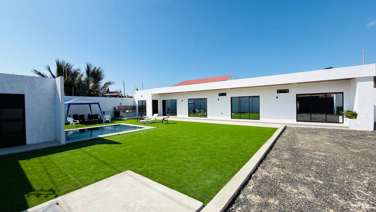 Beautiful vacation home in front of the sea, with a spectacular social area facing the Pacific The house has all the facilities for a comfortable stay with the family, enjoying the excellent Manabi climate, and relaxing in the private Jacuzzi without disconnecting from the world with WiFi. It is 5 minutes from the airport, 15 minutes from the Mall del Pacífico, and 30 minutes from Santa Marianita.