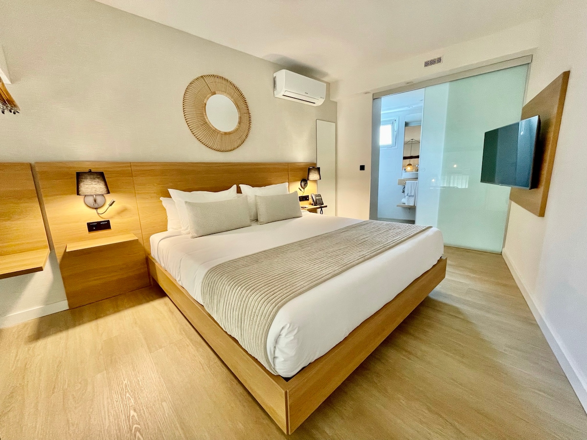 Loft Superior tipo dúplex, con doble ventanal y balcón francés. En planta hay completo office y salón con TV de 55´ y en planta alta esta el dormitorio con cama king, el baño y TV de 43´. Se ubica en la primera planta, de fácil acceso tanto por ascensor o escaleras, es ideal para 3 personas o 2 adultos con 2 niños (4-12 años) y un bebe (0-3 años). La cocina tipo office esta totalmente equipada con nevera, microondas, fregadero, hervidor de agua, cafetera Nespresso y utensilios de cocina.