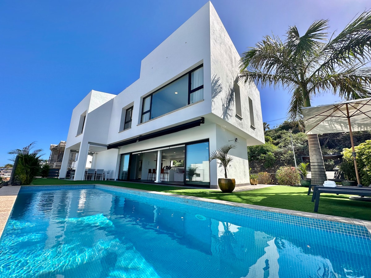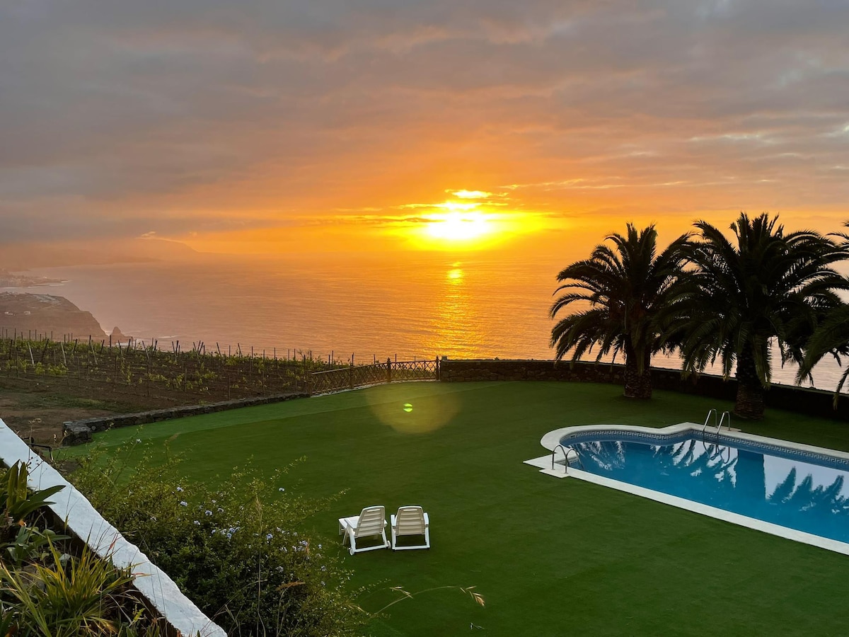 Moderna Villa de Lujo con Piscina privada( Climatizada opcional con coste extra) maravillosas vistas al Puerto de la Cruz, al Valle de la Orotava y al Teide, así como de la Isla de La Palma en el momento de la puesta de sol, de las que podrás disfrutar no solo desde la terraza y la piscina, sino desde la misma cama. Las habitaciones son auténticos miradores de cristal, cómodas y decoradas con encanto.