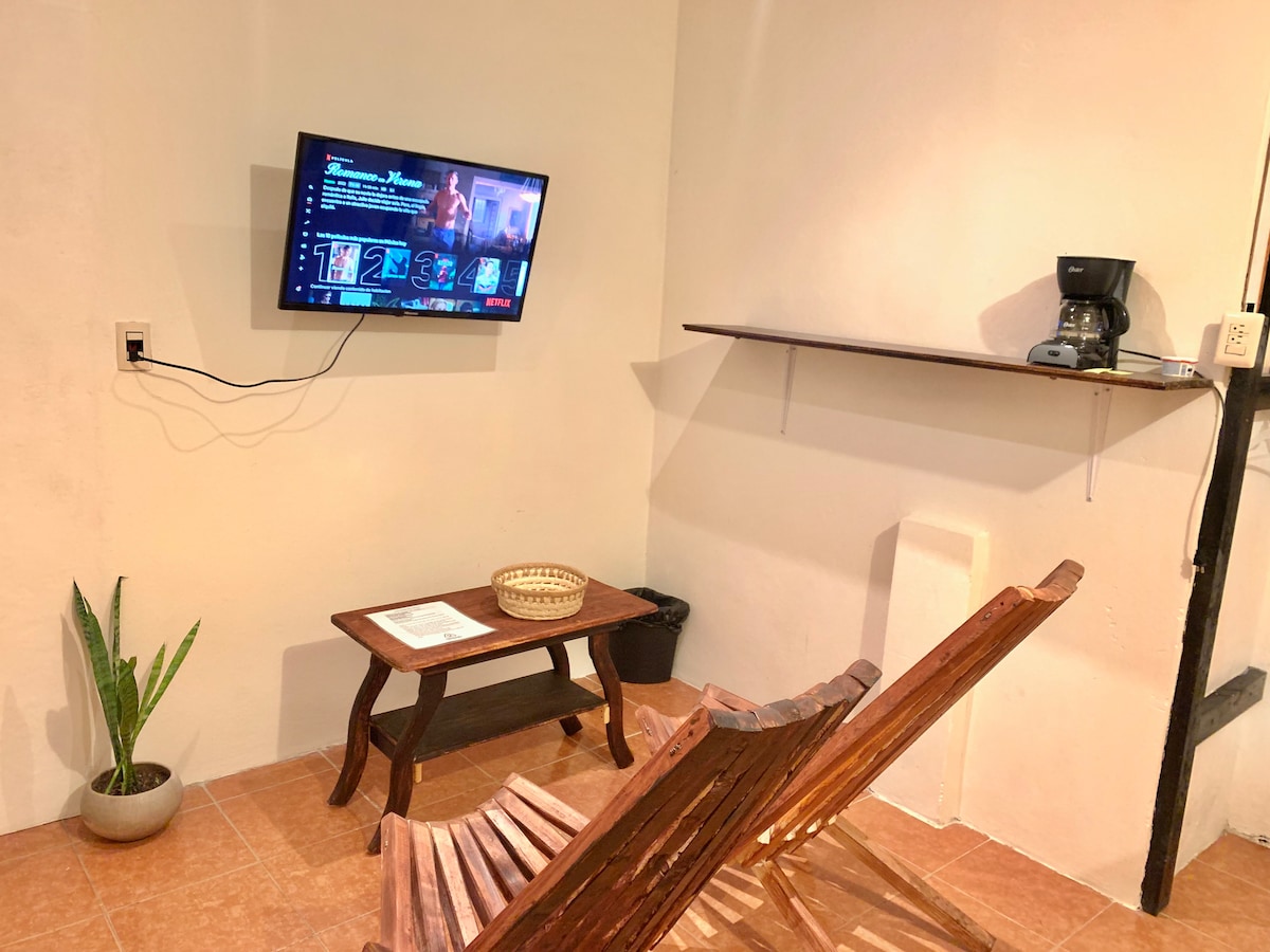 Es un espacio acogedor que se encuentra ubicado en el corazón de la ciudad , a una cuadra del cerrito de San Cristóbal, a tres del arco del carmen , a cinco del centro. También se encuentra cerca la terminal de la OCC y algunos transportes que van a Tuxtla , Comitán, entre otros municipios. El espacio cuenta con entrada independiente, se cuenta con horno de microondas, frigobar y cafetera, así como televisión con cable y WIFI. Se cuenta con estacionamiento.