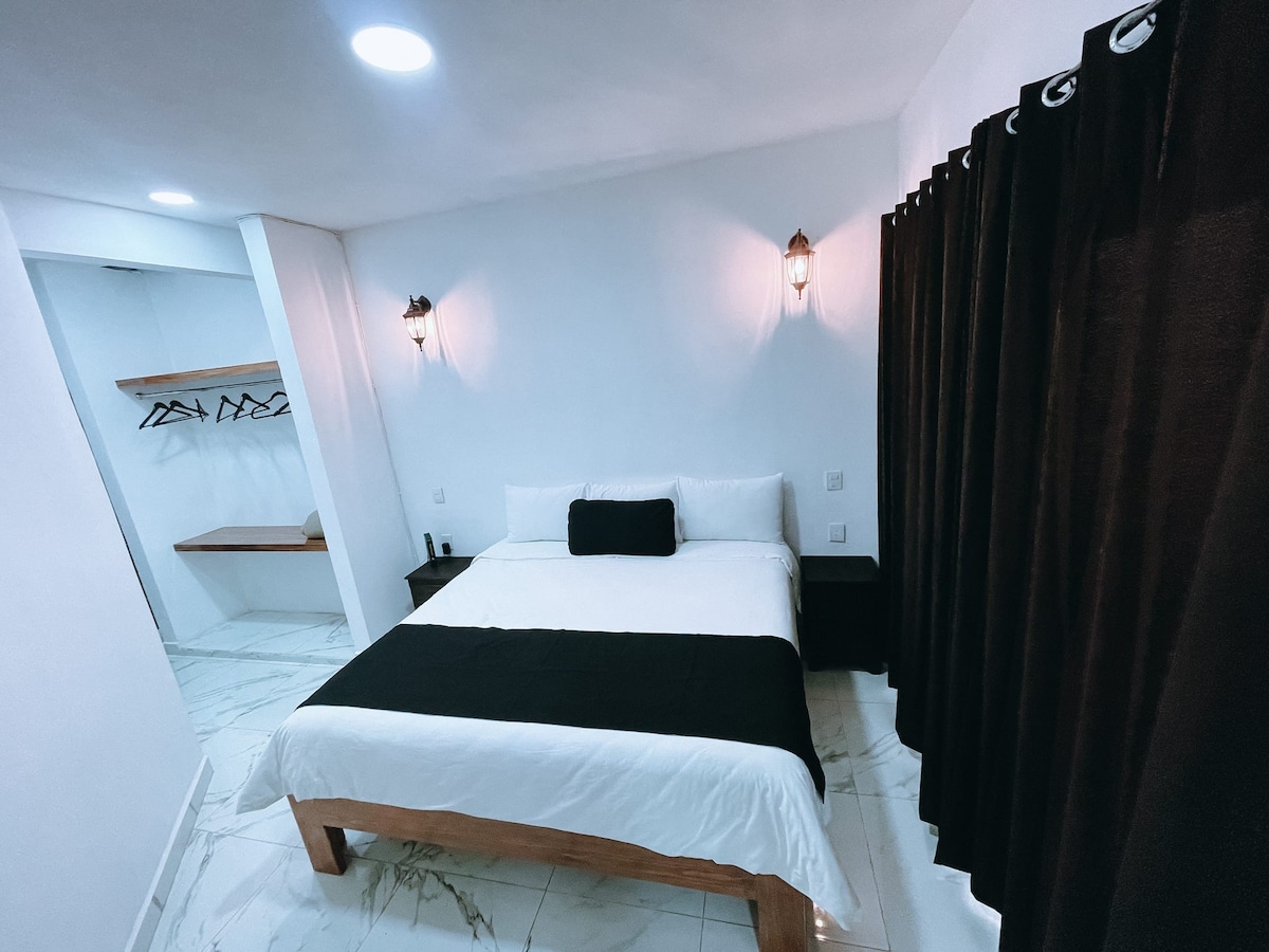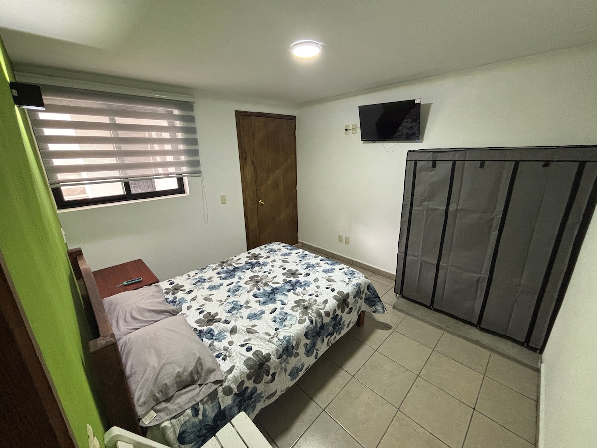 Relájate en esta habitación tranquila, con cama King size TV. Netflix, internet y baño privado. sala y cocina es compartida con otros huéspedes.