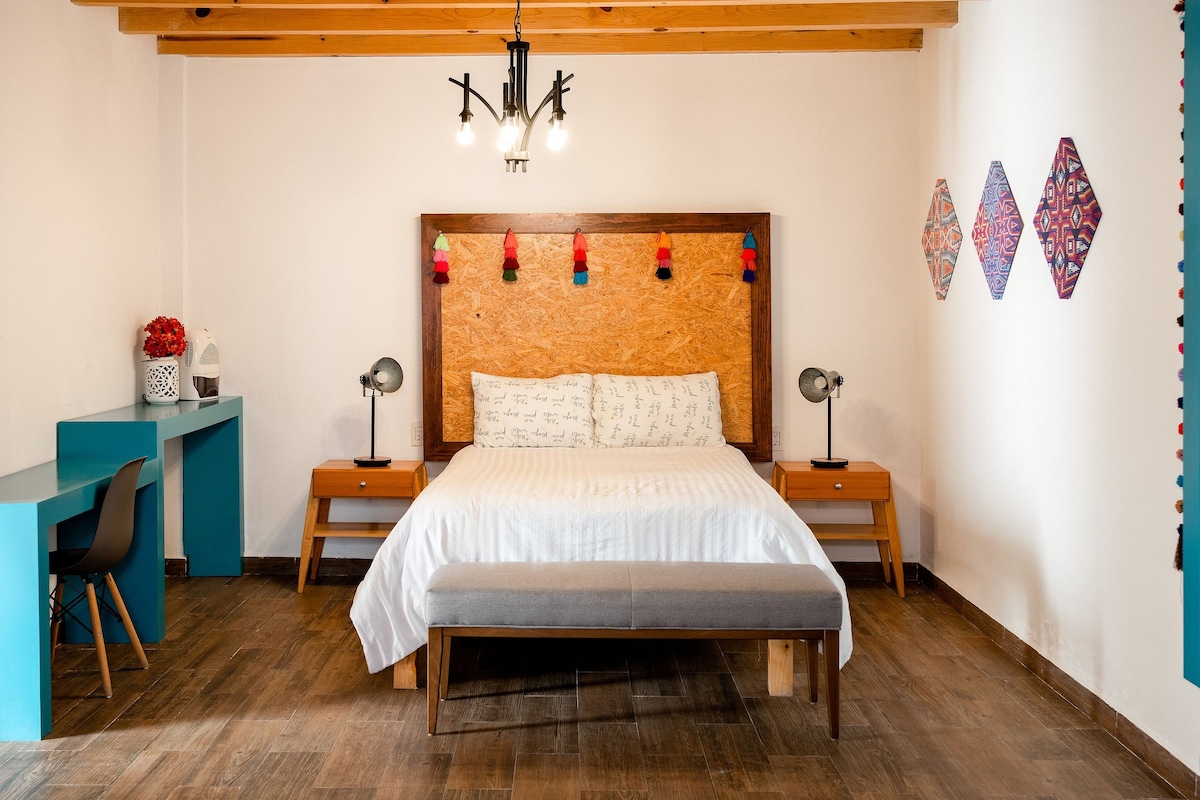 Este hermoso y acogedor alojamiento tiene una ubicación excepcional: ¡será muy fácil planear tu visita a todos los lugares de interés!, ubicado a tan solo 20 metros del parque central , es perfecto para venir en solitario o en pareja, ideal para estancias largas o cortas, cuenta con cocina equipada, área para trabajar, una cómoda cama para descansar con la tranquilidad que ofrece este agradable espacio.
