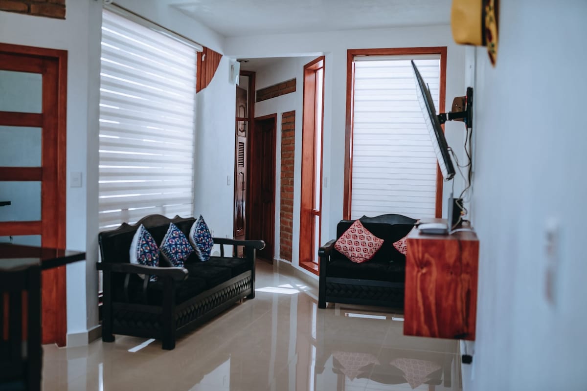 ¡Ubicación inmejorable! Encantador departamento a solo 20 m del zócalo de San Cristóbal. Conserva su esencia con muros de adobe y vigas de madera originales. Relájate en la terraza techada con el sonido de la fuente o disfruta de una noche junto a la chimenea. Cuenta con estacionamiento dentro de la propiedad, un gran plus en el centro. Ideal para escapadas románticas, en familia, amigos o estancias largas. Comodidad, estilo y autenticidad para viajeros que buscan una experiencia única.