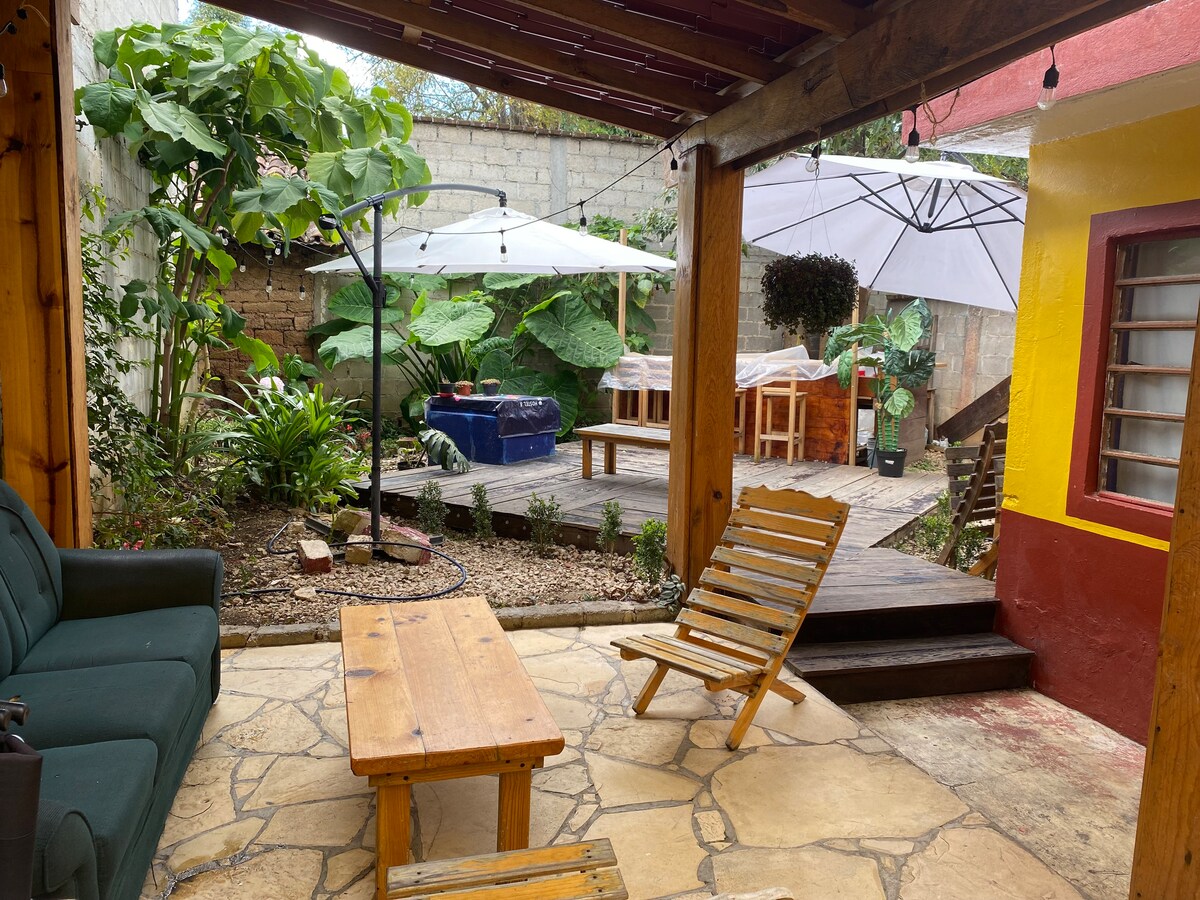 The perfect mix of down town confort and in house entertaiment for your friends or family! From watching the sunset from the hammocks on the tree house, enjoying a bonfire in the yard to laying back after a day trip with Netflix and take out, in front of the fireplace. Plus, amenities like a spacious and equipped kitchen, yard games and even a michelada station. In the heart of town! Only a few steps from the artisanal market, museums, cafés, convenience stores. 5 blocks from the central plaza.