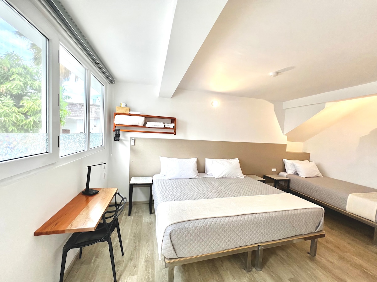 Descansa en un espacio con ventanas de doble vidrio que reducen el ruido exterior, equipado con colchones, sábanas y toallas de estándar internacional. Ubicado en Playa de Oro, en un segundo piso a pocos pasos del Malecón. cercanía a tiendas de alimentos, lavanderías, farmacias y panaderías.