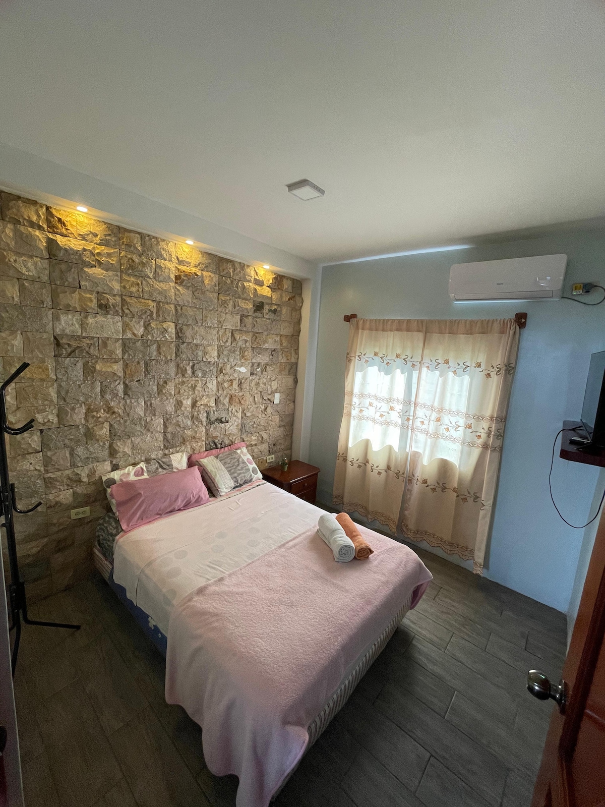 Dispongo de una mini suit en un primer piso la habitación muy comoda bonita con un pequeño balconcito a la parte de atrás de la casa pero también se puede observar parte de las calles es muy intima perfecta para disfrutar o trabajar a 10 minutos del aereopuerto y de las playas cerca de todo