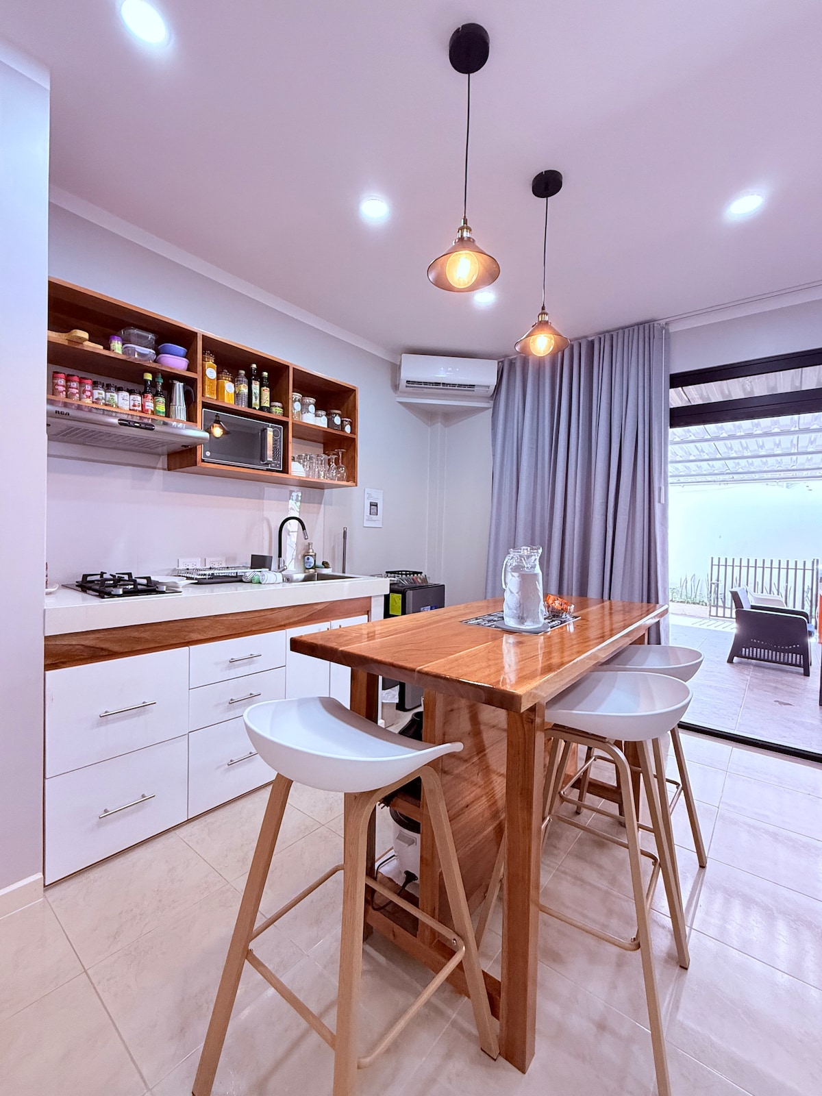 Enjoy a comfortable stay at Galápagos Villas, ideal for couples seeking peace and comfort. The space features a Queen bed, a large kitchen island, a two-door refrigerator, air fryer, microwave, coffee station, and a bathroom with volcanic stone and wood details. In front of the accommodation, you’ll find a matazarno tree. We also offer Starlink, a 55” TV with Netflix, complimentary drinking water, and useful information about tours in San Cristóbal during your trip.