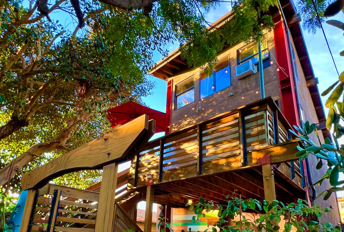 The Golden Hill Tree House is an urban oasis hiding in the branches of two mature trees in the heart of San Diego. While you enjoy elevated privacy you can also treat yourself to a soaker tub with double shower heads or settle down in a cozy reading nook to enjoy a good book! You'll also be walking distance to some amazing restaurants and super close to the best of San Diego, including downtown, the beach and the zoo! It's a perfect place to recharge after a long day of business or pleasure!