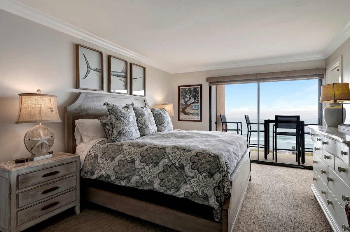 Located along the picturesque cliffs of Solana Beach is this modern, sun-filled condo with endless ocean views from its floor to ceiling windows. The condo offers beachside living at its finest with a fully equipped kitchen, an inviting living area and workspace overlooking the ocean, a sleeper sofa, a king bedroom and 2 sunny balconies ideal for watching the sunset. Stay just a short stroll to heart of town or stay in and enjoy the ocean views as you luxuriate in the complex pool and jacuzzi.