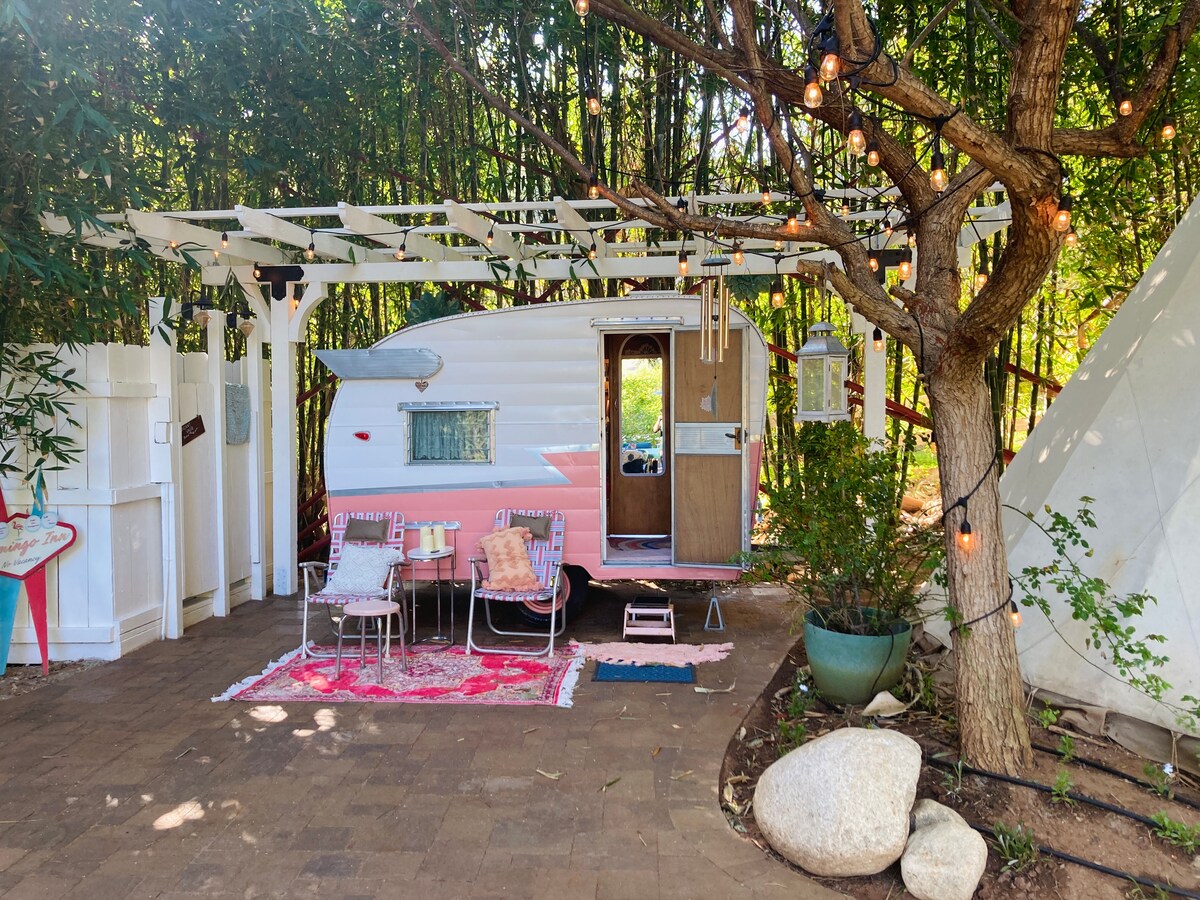 复古粉色沙斯塔拖车,带印第安帐篷和户外厨房