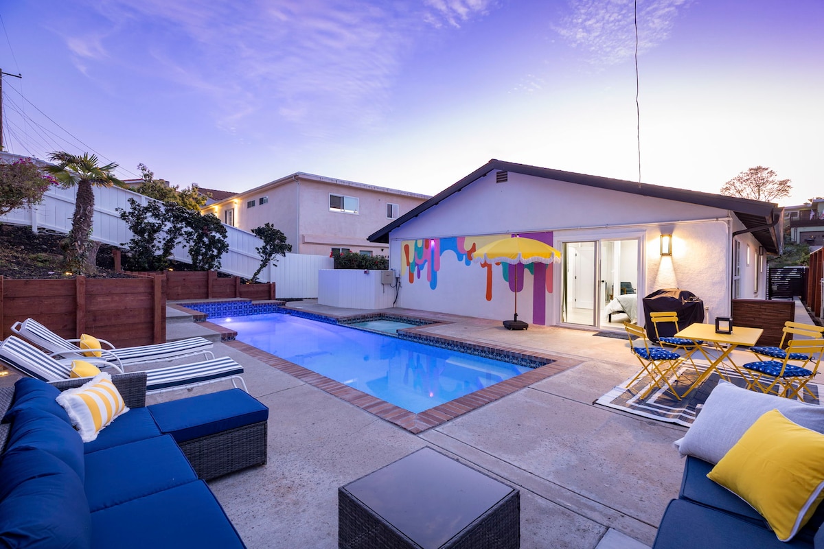 Escape to our boho-inspired Bird Rock/La Jolla beach house, perfect for families! This serene La Jolla retreat features a private pool, large hot tub, and cozy fire pit. Enjoy a private backyard oasis with hammocks and a BBQ. Recently upgraded with modern decor and new appliances, this home comfortably accommodates your group for the ultimate relaxing getaway just minutes from La Jolla Cove and famous beaches.