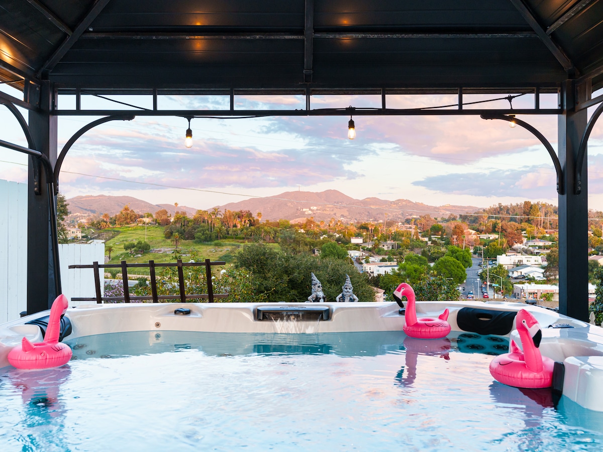 Escape to a charming and secluded 4BR/2BA retreat that's perfect for families, wedding stays, and friends. This one-story home boasts a spacious living area, amazing views, fully equipped kitchen, a state-of-the-art game room, and a beautiful backyard patio. Game Room w/ Vintage Games, Pool Table, Hot Tub, Toys, Basketball Hoop, Mountain Views, Pack n’ Play, BBQ, Gated Property. 20 minutes to Legoland/Beaches, 35 minutes to San Diego Zoo, Safari Park and Sea World, 1 hour to Disneyland.